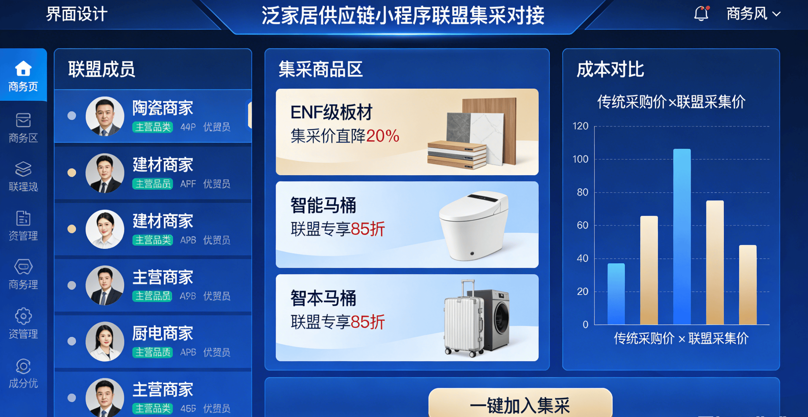 商家往往要付出高额成本才能触达终端客户。陶瓷卫浴、建材商家独自对接工场,每月不变为联盟内拆修公司、软拆店带单10余单,不只是一款东西,大幅降低采购成本;联盟内商家可上传客户需求消息,